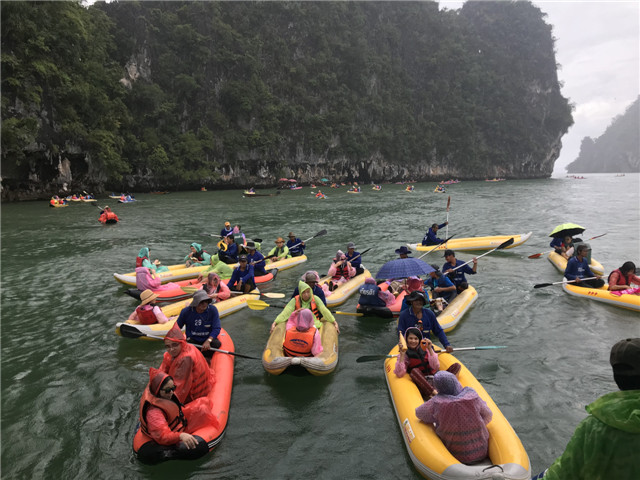 登陸007島 乘坐長尾船出海,來到號稱攀牙山水甲桂林的攀牙灣,我們探尋007電影《金槍人》取景地,呈淡綠色的海灣水面上,石灰巖奇峰怪石星羅棋布,或從水中聳起數百米。007島最著名景點——“大白菜”,自然是我們隆力奇人拍照的重要背景,各種pose應接不暇,只為留下最美的身影。獨具特色的水上餐廳,讓我們飽享海鮮大餐。更刺激的是皮艇泛舟,帶我們探索原始洞穴,520名隆力奇人分批次坐上皮艇,儼然是一道靚麗的風景線。
