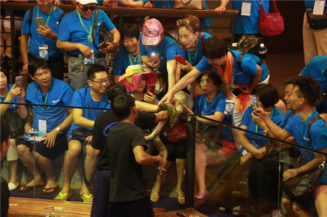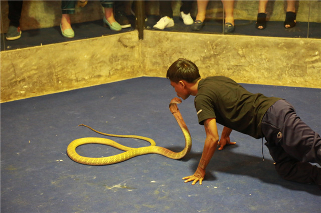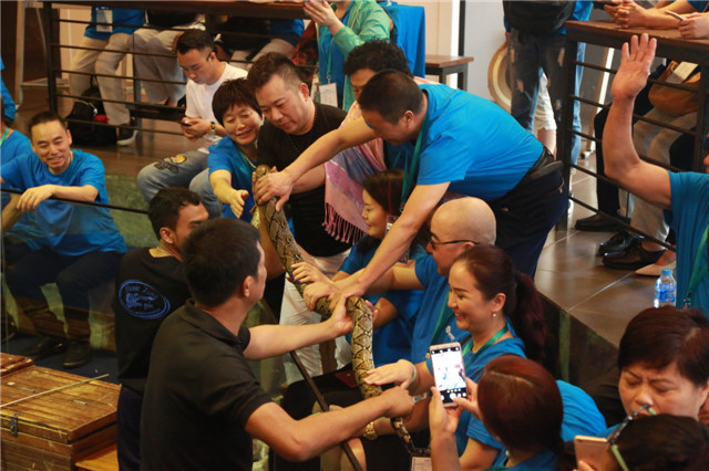 探秘毒蛇研究中心 本次隆力奇普吉島奇幻之旅,毒蛇研究中心自然是重點旅游項目之一,研究中心展示廳內有眼鏡蛇、蝮蛇、赤練蛇、金環蛇、銀環蛇等數十種毒蛇,或盤形環狀在地上休息,或攀在樹上,居高臨下,悠然自得。同時研究中心的工作人員還給我們表演了精彩的“人蛇秀”,空手捉蛇、親吻眼鏡蛇等驚險環節讓我們驚叫連連,同時我們還與這些毒蛇親密接觸,撫摸蛇身,或盤在自己身上合影。蛇作為隆力奇的重要文化,在普吉島能夠以這樣的方式與蛇親密接觸,這是我們隆力奇人的不同文化體驗。