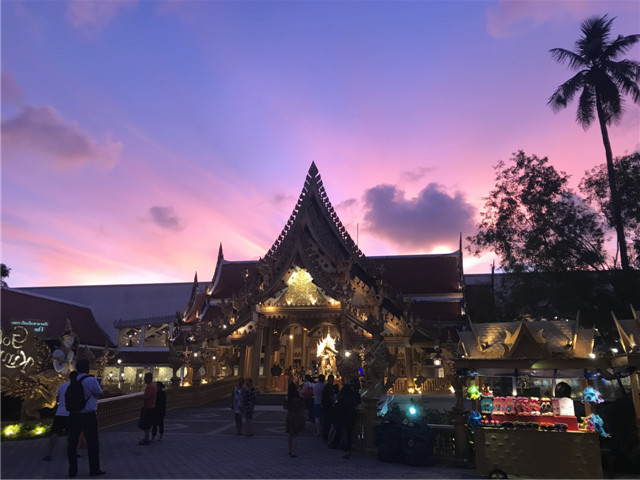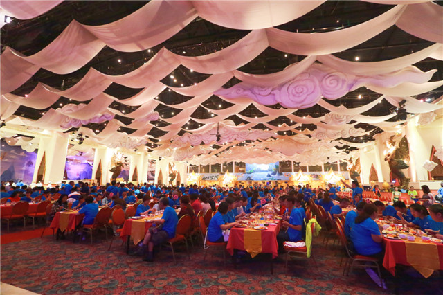 夜游幻多奇 這個與夜間才開放表演幻多奇確實是個夢幻樂園,是泰國本土的迪斯尼,又如拉斯維加斯秀場令人驚嘆,我們在裝修金碧輝煌、可容納4000人的金娜麗餐廳用餐,突然全場燈光變暗,一曲《happ birthday》想起,餐廳工作人員走進我們,原來恰逢我們團有人今天過生日,這一細心安排,讓我們非常感動,同時能夠與520名家人一起過生日,這也許是終生難忘的。主題樂園里泰國風格紀念品琳瑯滿目,每個攤位都穿梭著帶有longrich標志的人群,一出具有泰國文化歷史之旅的夢幻劇,讓我們從視覺和聽覺上久久不能忘懷。