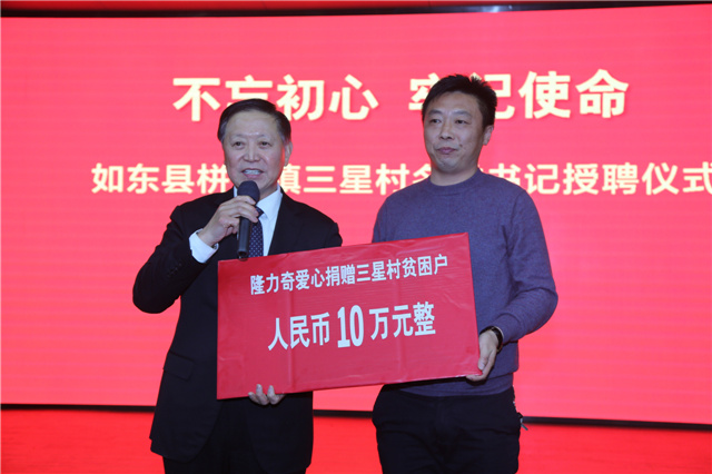2月9日,江蘇省如東縣栟茶鎮(zhèn)三星村的鎮(zhèn)村領導在隆力奇總部舉行了一場隆重的儀式,為隆力奇董事長徐之偉 頒發(fā)三星村榮譽村書記證書,現(xiàn)場還舉行了隆力奇捐贈三星村貧困戶10萬元現(xiàn)金的愛心捐贈儀式。