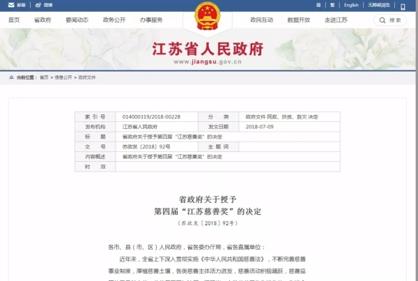 日前,從江蘇省人民政府文件(蘇政發(fā)〔2018〕92號)獲悉:共有28家單位、27名個(gè)人和20個(gè)慈善項(xiàng)目受到江蘇省政府表彰,江蘇隆力奇生物科技股份有限公司被授予第四屆“江蘇慈善獎”。這是隆力奇連續(xù)兩屆榮膺“江蘇慈善獎”,也是繼“社會責(zé)任最佳實(shí)踐獎”、“蘇州市慈善企業(yè)”、“慈善榜樣獎”、2015中國食品企業(yè)履行社會責(zé)任十大優(yōu)秀案例、蘇州市“最具愛心企業(yè)”稱號后獲得的又一殊榮。