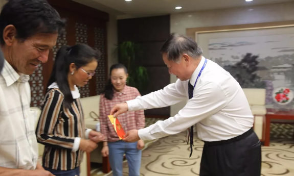 8月16日,由隆力奇“愛家眼科基金”救助的兩名藏族斜視患者次仁拉姆、次仁曲吉已恢復良好順利出院。為表達感激,次仁拉姆、次仁曲吉及其父親專程來到隆力奇,向隆力奇董事長徐之偉送上錦旗,以表心意。徐之偉親手向兩名藏族女孩送去了慰問金。