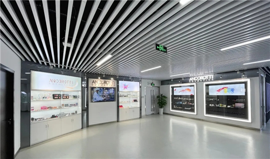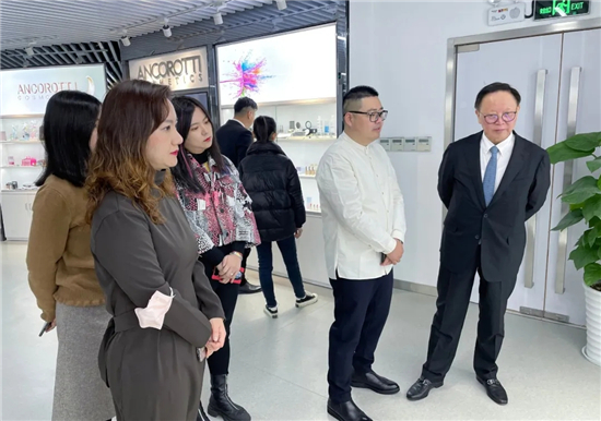 徐之偉一行首先參觀了安珂蒂的化妝品陳列間,并親身試用了多款暢銷網紅產品。安珂蒂事業(yè)部總經理秦賽、克勞麗市場部總監(jiān)陸逸雯、安珂蒂華東區(qū)銷售總監(jiān)曹律敏、安珂蒂護膚市場部高級經理陸瑤瑤等陪同參觀,并針對產品進行講解闡述。