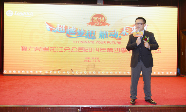11月9日,以“超越夢想·耀動未來”為主題的隆力奇黑龍江分公司2014年第四季度展業論壇在哈爾濱銀河大酒店隆重召開,隆力奇定制營銷中國區總裁何健、黑龍江分公司負責人于存術、隆力奇高級經銷商孫國理、劉玉榮、劉云川、維驤、付桂鳳&郝振宇伉儷、施雨含、欒翔、孔毅、王一涵等攜近500名隆力奇經銷商出席盛會。
