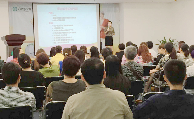 在福建家人熱烈的掌聲中,沈逸老師走上講臺,優(yōu)美的身姿和文雅的談吐一下子就征服了現(xiàn)場所有的觀眾。沈逸老師用專業(yè)知識帶領(lǐng)大家一起認(rèn)識了皮膚的結(jié)構(gòu)和各種膚質(zhì)的特點,讓所有家人對自身的皮膚有了一定的了解。接著又向大家介紹了隆力奇雅璨系列護(hù)膚產(chǎn)品的特性以及其如何改善人體膚質(zhì),幫助肌膚補(bǔ)水,使肌膚達(dá)到水油平衡,最終達(dá)到嬰兒般的膚質(zhì)。人的皮膚同樣會隨著人體年齡增長而衰老松弛,而選用好的護(hù)膚產(chǎn)品,并加以調(diào)養(yǎng)呵護(hù),一般能夠使正常皮膚年輕10歲。