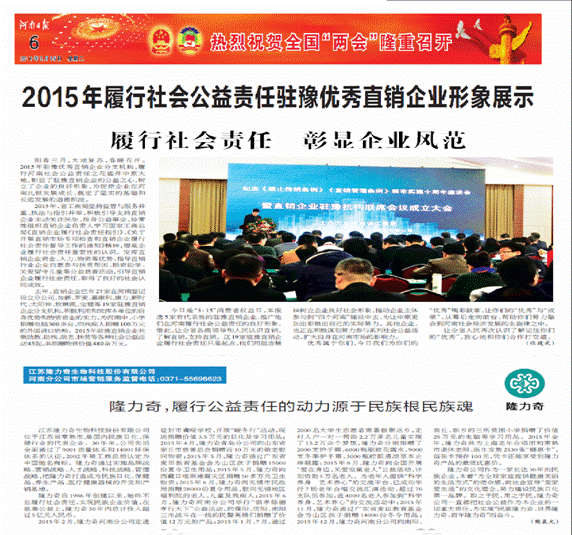 2016年3月15日,河南日報專刊刊登了 “2015年履行社會公益責任駐豫優秀直銷企業形象展示”。隆力奇憑借2015年對公益活動的積極參與及投入力度,獲得河南日報的邀請,在河南日報“315消費者權益日”專刊刊登了隆力奇公司2015年的公益活動項目。