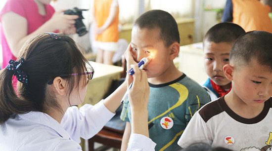 After the donation ceremony, volunteers and doctors spent the whole day examining the children’s sight, especially those with poor sight. Many children’s sights have been getting poorer and poorer because of being addicted to TV programs; many students with poor sight are doing homework in wrong sitting positions, though wearing glasses, no further examination has been conducted ever since. Ms. Chen Yu, the doctor from Lixiang Eye Hospital, said that a sight examination instrument will be used to further examine children with a sight poorer than 0.6; for children with strabismus or amblyopia, it is better for them to get early treatment in case of missing the best curing period.