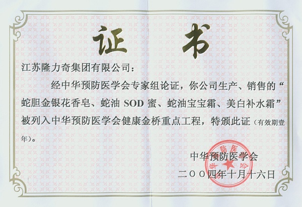 2004: Longliqi snake products, shampoo, facial cleanser, toilet water and other products passed the test check of China Preventive Medicine Association, was designed as ‘’Health Golden Bridge ‘’ key projects and their logo authorized to be used.