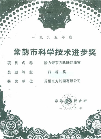 1996: Changshu Snake Industry Company was honored by Changshu municipal committee party and won the prize. ‘’ Competitive Enterprise of the year 1995‘’