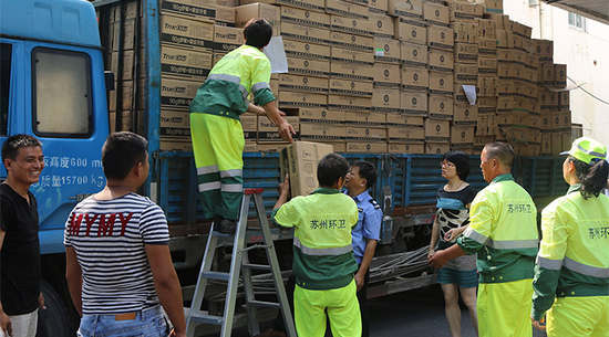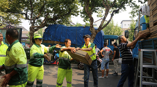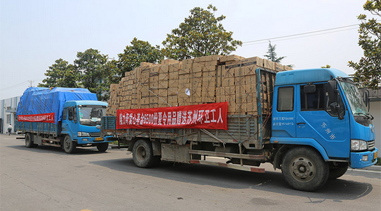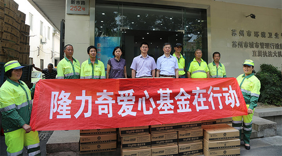 7月14日下午,滿載著隆力奇夏令用品的兩輛卡車駛出了工廠大門,隆力奇愛心基金會徐曉峰會長帶領隆力奇愛心基金會歡樂義工們來到了蘇州市環(huán)衛(wèi)工人管理處,向蘇州6500名環(huán)衛(wèi)工人帶去了6500份價值85萬元夏令用品。